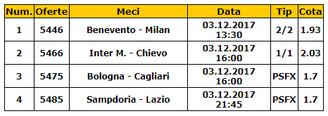 Bilet Italia etapa 15. Pentru duminica v-am pregatit un tichet format din patru meciuri din Serie A: Benevento – Milan, Inter – Chievo, Bologna – Cagliari si Sampdoria – Lazio.