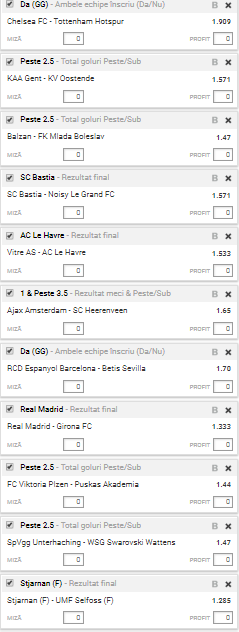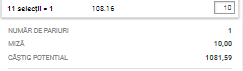 * Aşa cum îţi spuneam mai sus, cota totală a biletului este de 108.16! Am decis să pariez 10 de ron pentru un câştig potenţial de 1080 de lei!