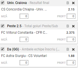 Al doilea meci despre care vom vorbi este cel dintre Viitorul si CFR Cluj, care se disputa sambata seara, de la ora 21:45. Trupa lui Gica Hagi are evolutii bune in ultima perioada, inregistrand trei victorii in precedentele patru jocuri: 1-0 cu Gaz Metan, 5-2 cu cu CSM Poli Iasi si 3-0 cu Juventus. De partea cealalta, CFR Cluj vine dupa remiza, scor 0-0 cu FC Botosani. Inainte de acest rezultat de egalitate, CFR Cluj avea o serie de doua victorii consecutive: 2-0 cu Juventus si 3-2 cu Astra Giurgiu. La acest meci iti recomandam sa mizezi pe un meci care sa produca minimum trei goluri.