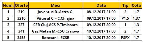 Bilet Romania etapa 21. Pentru acest final de saptamana ti-am pregatit un tichet dedicat in totalitate etapei din Liga I. Avem cinci meciuri, dupa cum urmeaza: Juventus – Astra, Viitorul – Concordia, CFR Cluj – ACS Poli, Gaz Metan – CSU Craiova si Botosani – FCSB.