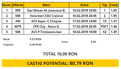 Bilet Romania etapa 25. Pentru acest final de săptămână ți-am pregătit un tichet dedicat etapei cu numărul 25 din Liga I, penultima a sezonului regulat. Meciurile selectate sunt Gaz Metan – Juventus, Voluntari – CSU Craiova, CFR Cluj – Astra, ACS Sepsi – Concordia și ACS Poli Timișoara – CSM Poli Iași.