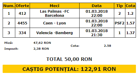 Bilet VIP 01.03.2018. Biletul vedetă de joi este format din trei meciuri. Discutăm despre două meciuri de fotbal, Las Palmas – Barcelona și Caen – Lyon, plus un meci de baschet din Euroligă, Valencia – Bamberg.