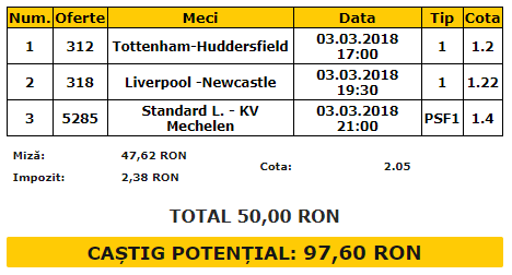 Bilet VIP 03.03.2018. Biletul vedetă de sâmbătă este format din trei meciuri, două din Premier League, Tottenham – Huddersfield și Liverpool – Newcastle, respectiv unul din campionatul Belgiei, Standard Liege – Mechelen.