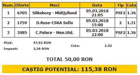 Marcus Rashford si coechipierii sai. Bilet VIP 05.03.2018. Trei meciuri ți-am selectat pentru biletul VIP de luni. Este vorba despre Silkeborg – Midtjylland, Dunav Ruse – ȚSKA Sofia și Crystal Palace – Man. United.