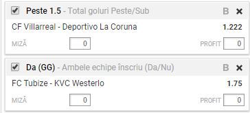 Bilet VIP 07.01.2018. Doua meciuri alcatuiesc tichetul nostru de duminica. De la ora 19:30, Villarreal primeste vizita lui Deportivo la Coruna intr-un meci care conteaza pentru etapa cu numarul 18 din La Liga. In esalonul secunda din Belgia avem un meci de la care ne asteptam la goluri: FC Tubize – Westerlo.