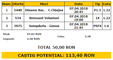 Bilet VIP 07.04.2018. Pentru sâmbătă ți-am pregătit un bilet vedetă format din trei meciuri, două din Liga I și unul din Serie A. Partidele Dinamo – Concordia Chiajna, Botoșani – Voluntari și Sampdoria – Genoa ne oferă o cotă de 2.38.