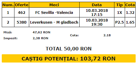 Bilet VIP 10.03.2018. Biletul vedetă de sâmbătă este format din două derbiuri ale Europei, unul din Spania și unul din Germania. Vorbim despre FC Sevilla – Valencia și Leverkusen – Monchengladbach.