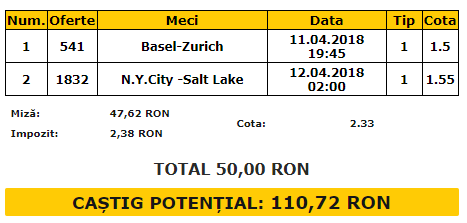 Bilet VIP 11.04.2018. Biletul vedetă de miercuri este format de două meciuri ceva mai exotice. Vorbim despre FC Basel – FC Zurich și New York City – Salt Lake, care ne oferă o cotă 2.33