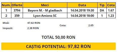 Bilet VIP 14.04.2018. Meciurile Bayern Munchen – Borussia Monchengladbach și Lyon – Amiens formează biletul vedetă de sâmbătă. Mizăm pe un meci în care ambele marchează în Bundesliga și pe o victorie a lui Lyon, la o cotă cumulată de 2.05.