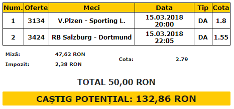 Un alt meci cu goluri multe îl așteptăm în Austria, unde RB Salzburg primește vizita celor de la Borussia Dortmund. Nemții sunt obligați să atace, după ce au pierdut meciul tur cu 1-2. Valon Berisha a marcat o dublă pentru campioana ultimelor patru sezoane din Austria, dar Andre Schurrle a reaprins speranțele pentru Borussia. Totuși, Salzburg este o echipă redutabilă pe teren propriu. Este neînvinsă de 18 meciuri în competițiile europene, timp în care a înregistrat 11 victorii și 7 remize. Echipa a terminat neînvinsă faza grupelor pentru a patra oară, un record în sine în cea mai tânără competiție a Europei. Participanți pentru a șaptea oară în UEFA Europa League, austriecii se află totuși la doar a doua prezență în optimile de finală. De cealaltă parte, Borussia Dortmund are ocazia să pună capăt unei serii de șapte meciuri fără victorie în deplasare. Ceea ce ne face să credem însă că ambele echipe vor marca este faptul că Borussia a dat și a primit gol în toate cele nouă meciuri europene disputate în acest sezon.