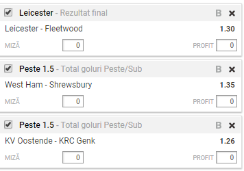 Bilet VIP 16.01.2018. De data aceasta, tichetul VIP de marti este format din trei meciuri. Toate sunt clare si exista o sansa buna sa fie toate verzi: Leicester – Fletwood si West Ham – Shrewsbury din Cupa Angliei. Celalat meci se disputa in prima etapa in 2018 din campionatul Belgiei: Oostende – Genk, partida programata la ora 21:30.