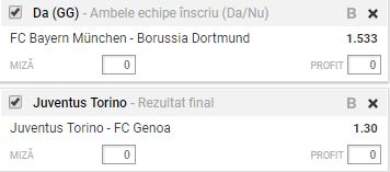 Bilet VIP 20.12.2017. Doua meciuri alcatuiesc tichetul nostru de miercuri. Ambele se disputa de la ora 21:45 si sunt programate in cadrul Cupelor din Germania, respectiv, Italia. Cel mai interesant meci este derby-ul Germaniei: Bayern Munchen – Borussia Dortmund. In Italia, Juventus Torino joaca impotriva Genoei, pentru un loc in sferturile de finala.
