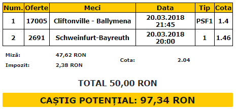 Bilet VIP 20.03.2018. Două meciuri ți-am selectat pentru tichetul vedetă de marți: Schweinfurt – Bayreuth, din liga regională germană, respectiv Cliftonville – Ballymena, din Irlanda de Nord.