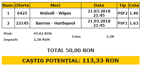 Bilet VIP 21.03.2018. Două meciuri din ligile inferioare engleze formează biletul vedetă de miercuri. Vorbim despre Walsall – Wigan, din Ligue One, respectiv Barow – Hatlepool, din National League.