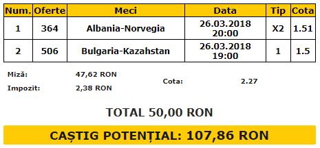 Bilet VIP 26.03.2018. Tichetul vedetă de luni este forma din două meciuri amicale și ne oferă o cotă de 2.27. Vorbim despre Albania – Norvegia și Bulgaria – Kazahstan.
