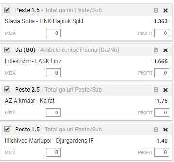 AZ Alkmaar – Kairateste. Noua formație a lui Dorin Rotariu este surpriza neplăcută a meciurilor tur. Olandezii au plecat clar ca favoriți în Kazakhstan, dar au pierdut cu 0-2. Alkmaar are șansa de a se revanșa în fața publicului, dar și față de noi pariorii, ne mulțumim cu minimum 3 goluri în meci. Baftă!