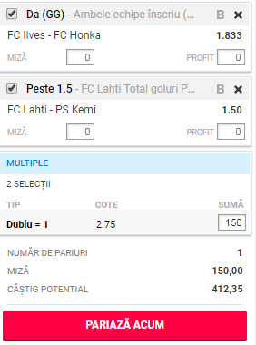 Sursa> Twitter Bilet Zilei pe goluri pentru 5 august, 2018. Am analizat pentru biletul pe goluri de astăzi două meciuri din prima ligă a Finlandei.