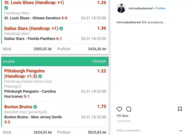Biletul din NHL i-a adus suma de 1.333 de RON, în vreme ce pariurile pe fotbal i-au produs suma de 1.464 RON. Ținând cont că pe ambele bilete a pus 1.000 de RON, profitul nu este unul chiar mare, doar de 797 de RON. Ultima oară când Mirca Badea postase un bilet, a fost cu 2 luni în urmă. Realizatorul TV a pariat atunci 3.000 de RON că Ronald Gavril va câștiga meciul cu David Benavidez, pentru titlul mondial WBC la categoria super-mijlocie. A pierdut atunci, întrucăt americanul l-a bătut pe pugilistul român.