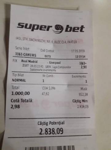 Seara precedentă, Real Madrid a câștigat a 13-a Ligă a Campionilor și a treia consecutivă. O mulțime de români au bifat bani frumoși de la pariuri datorită rezultatului înregistrat la Kiev: 3-1.