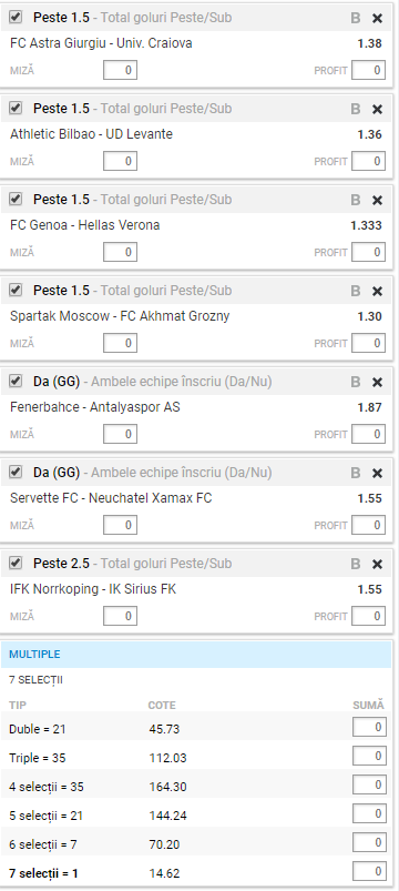 Începem săptămâna cu un bilet format din șapte meciuri, iar la absolut toate am ales să pariem pe goluri. Cota totală este una care îți va plăcea: 14,62. Trei din partidele importante de pe acest tichet sunt Astra – Craiova, Bilbao – Levante și Genoa – Verona. Vom vorbi pe larg despre ultima.