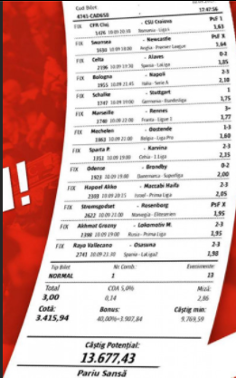 Biletul jucat de pariorul nostru si plasat la o agentie din cartierul Berceni a avut o cota totala de 3.415. Cel mai mare multiplicator de pe bilet a fost la confruntarea Sparta Praga-Karvina, din primul esalon al campionatului Cehiei. Bucuresteanul a pariat ca se vor marca intre doua si trei goluri. Casele de pariuri i-au dat o cota de 2,15 pentru un asemenea scenariu! Sparta Praga a castigat cu 2-0, golurile fiind inscrise in minutle 17 si 53.