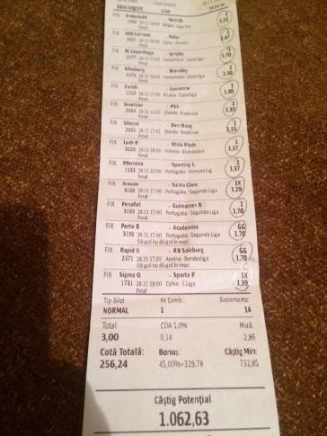Un astfel de castig decent, a fost ”opera” unui parior din Bucuresti. Acesta a jucat 14 evenimente pe un bilet, toate de sambata, 26 noiembrie. Nu s-a aruncat la campionatele puternice si a investit aproape 3 lei pe meciuri din Olanda, Portugalia, Cehia sau Elvetia. Toate au fost ”drepte” si a prins o cota toala de 256,24. Bucuresteanul, care e sustinator al echipei Dinamo, a beneficiat si de bonusul casei de pariuri unde a plasat biletul, astfel a castigat 1.062 de lei, o suma decenta, care nu va fi in niciun caz investita pentru meciurle de acasa a echipei din Stefan cel Mare, mai ales in conditiile in care elevii lui Miriuta stau cu gandul mai mult la sticlele de vin…