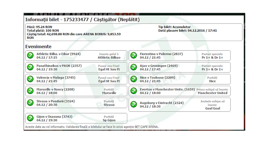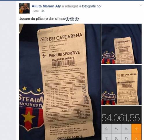Fotbalistii Stelei se bucura la golul lui Gabriel Tamas Bilete pariuri castigatoare. Fostul mijlocas al Stelei, Marian Aliuta, a realizat un castig urias la pariuri, reusind sa castige 42.698.88 lei, insemnand aproximativ 12.000 euro. Aliuta a pariat 100 lei pe biletul care era alcatuit din 11 meciuri, din diferite campionate ale Europei.