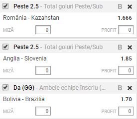 Biletul cu goluri de joi 05.10.2017 este alcatuit din trei meciuri, toate din preliminariile pentru Cupa Mondiala din Rusia: Romania – Kazahstan, Anglia – Slovenia si Bolivia – Brazilia.