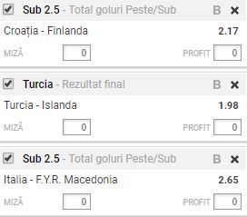 Biletul de cota 10.00 06.10.2017 de vineri este compus din trei partide, toate contand pentru etapa cu numarul opt a preliminariilor pentru Cupa Mondiala: Croatia – Finlanda, Turcia – Islanda si Italia – Macedonia.