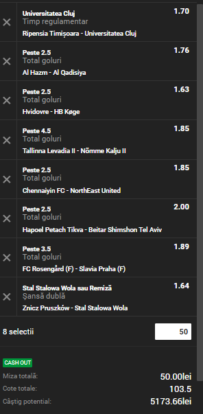 Biletul de cotă 100 de joi cuprinde următoarele meciuri: Ripensia Timișoara – Universitatea Cluj, câştigă oaspteţii, Al Hazm – Al Qadisiya, peste 2.5 goluri, Hvidovre – HB Køge, peste 2.5 goluri, Tallinna Levadia II – Nõmme Kalju II, peste 4.5 goluri, Chennaiyin FC – NorthEast United, peste 2,5 goluri, Hapoel Petach Tikva – Beitar Shimshon Tel Aviv, peste 2.5 goluri, FC Rosengård (F) – Slavia Praha (F), peste 2.5 goluri, Znicz Pruszków – Stal Stalowa Wola, oaspteţii nu pierd.