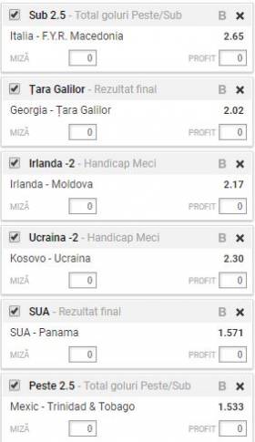 Biletul de cota 50.00 06.10.2017 de vineri este alcatuit din sase meciuri: Italia – Macedonia, Georgia – Tara Galilor, Irlanda – Moldova, Kosovo – Ucraina, SUA – Panama si Mexic – Trinidad & Tobago.