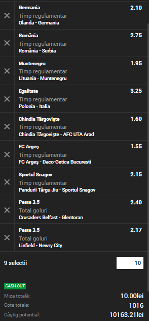 Aşa cum am scris mai sus, am 9 ponturi tari pentru acest weekend, toate combinate pe un singur bilet. Am ales pentru el două tipuri de pariu, învingătoare, pariu pe goluri şi un X de toată frumuseţea. Echipele în care am încredere că se vor impune sunt: Germania, România, Muntenegru, Chindia Târgovişte, FC Argeş şi Sportul Snagov. Atenţie! Cotele pentru aceste pronosticuri sunt destul de măricele. Evident că nu are cum să lipsească de pe el meciul echipei noastre naţionale, România – Serbia.