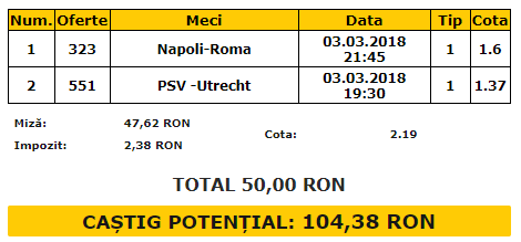 Biletul Zilei 03.03.2018. Două meciuri ți-am selectat pentru biletul de sâmbătă, meciuri care oferă o cotă cumulată de 2.19. Este vorba despre Napoli – AS Roma și PSV – Utrecht.