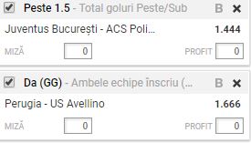 Biletul Zilei 06.11.2017. Ziua de luni este ceva mai saraca in fotbal, intrucat campionatele tari nu si-au extins meciurile pana in aceasta zi. Vin meciurile echipelor nationale, iar majoritatea jucatorilor si-au luat zborul catre tarile natale. Chiar si in aceste conditii sarace, ti-am alcatuit un bilet cu sanse mari de reusita. Acesta este format din doua partide: Juventus Bucuresti – Poli Timisoara si Perugia – Avellino.