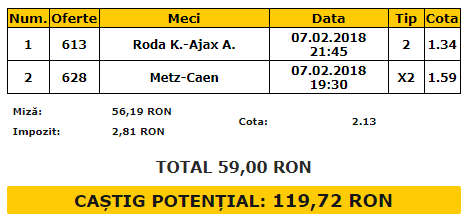 Biletul Zilei 07.02.2018. Doua meciuri v-am selectat pentru biletul de miercuri, unul din Olanda si unul din Franta: Roda Kerkrade – Ajax Amsterdam, respectiv Metz – Caen.