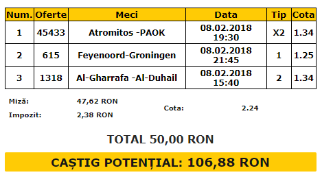 Biletul Zilei 08.02.2018. Tichetul zilei de joi este format din trei meciuri, cu o cota totala de 2.24. Vorbim despre Atromitos – PAOK, Feyenoord – Groningen si Al Gharafa – Al Duhail.