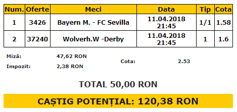 Biletul Zilei 11.04.2018 Bayern – Sevilla