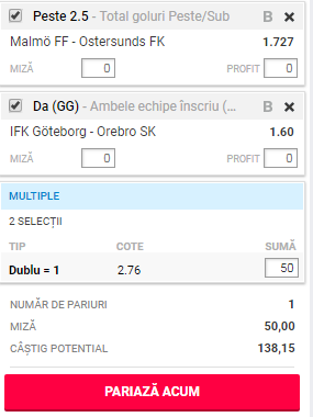 Malmo FF – Ostersunds. Gazdele au început extrem de greu campionatul și sunt pe locul zece momentan, au o linie de clasament de cinci victorii, trei rezultate de egalitate și cinci înfrângeri, iar golaverajul este destul de echilibrat (19-18).