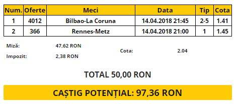Biletul Zilei 14.04.2018. Două meciuri formează biletul zilei de sâmbătă. Vorbim despre Athletic Bilbao – Deportivo La Coruna și Rennes – Metz, două partide care ne oferă o cotă cumulată de 2.04.