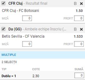 Biletul zilei 15.10.2017 este alcatuit din doua meciuri, care au sanse mari sa ne aduca profit: CFR Cluj – FC Botosani si Betis Sevilla – Valencia.