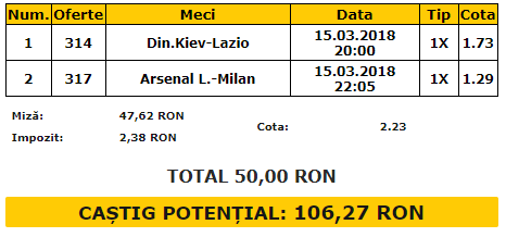 Biletul Zilei 15.03.2018. Biletul zilei de joi este format din cele mai interesante două meciuri ale serii de UEFA Europa League. Este vorba despre Dinamo Kiev – Lazio și Arsenal – AC Milan, iar în ambele cazuri mizăm pe faptul că gazdele nu vor pierde.