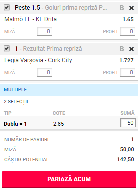 - Pariază până la 250 de lei fără risc pe acest bilet. Spre exemplu. Dacă depui 50 de lei și biletul nostru cade, primești banii înapoi imediat!