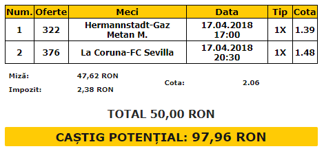 Biletul Zilei 17.04.2018. Biletul zilei de marți este format din două meciuri, Hermannstadt – Gaz Metan, din Cupa României, și La Coruna – Sevilla, din etapa intermediară din Spania. Cele două ne oferă o cotă cumulată de 2.06.