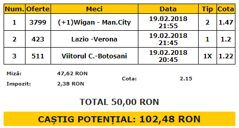 Biletul Zilei 19.02.2018. Pentru luni v-am pregătit un bilete format din trei meciuri, după cum urmează: Wigan – Manchester City, Lazio – Verona și Viitorul – FC Botoșani.