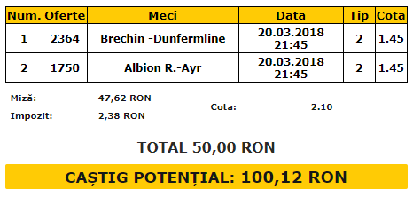 Biletul Zilei 20.03.2018. Tichetul zilei de marți este format din două meciuri din ligile inferioare ale Scoției, cu o cotă combinată de 2.10: Brechin – Dunfermline și Albion Rovers – Ayr United.
