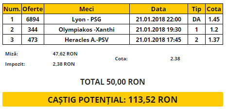 Biletul Zilei 21.01.2018. Pentru duminica va propunem un bilet format din trei meciuri, din trei campionate diferite ale Europei: Lyon – PSG, Olympiakos – Xanthi si Heracles – PSV.