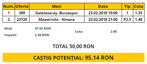Biletul zilei 23.02.2018. Ti-am pregătit un tichet alcătuit din două meciuri, Galatasaray – Bursaspor și Maastricht – Almere City. Pariem pe o victorie a grupării Cim Bom și pe un meci cu multe goluri în liga a doua din Olanda.