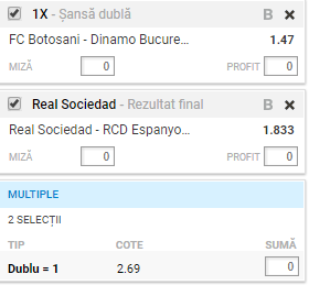Ultimul Derby de Romania, dintre FCSB si Dinamo. Biletul zilei 23.10.2017 de luni este alcatuit din doua meciuri: FC Botosani – Dinamo si Real Sociedad – Espanyol Barcelona.