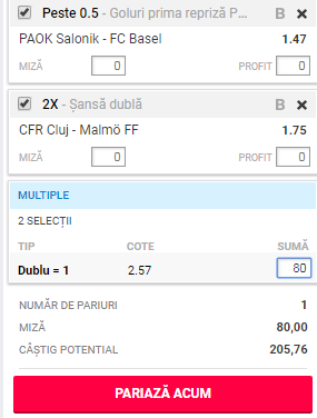 - Pariază până la 250 de lei fără risc pe acest bilet. Spre exemplu. Dacă depui 50 de lei și biletul nostru cade, primești banii înapoi imediat!