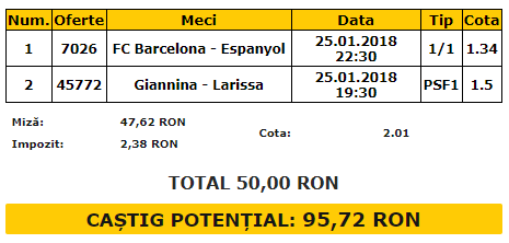 Biletul Zilei 25.01.2018. Pentru tichetul de joi v-am selectat doua meciuri, care iti vor dubla investitia: FC Barcelona – Espanyol si PAS Giannina – Larissa.